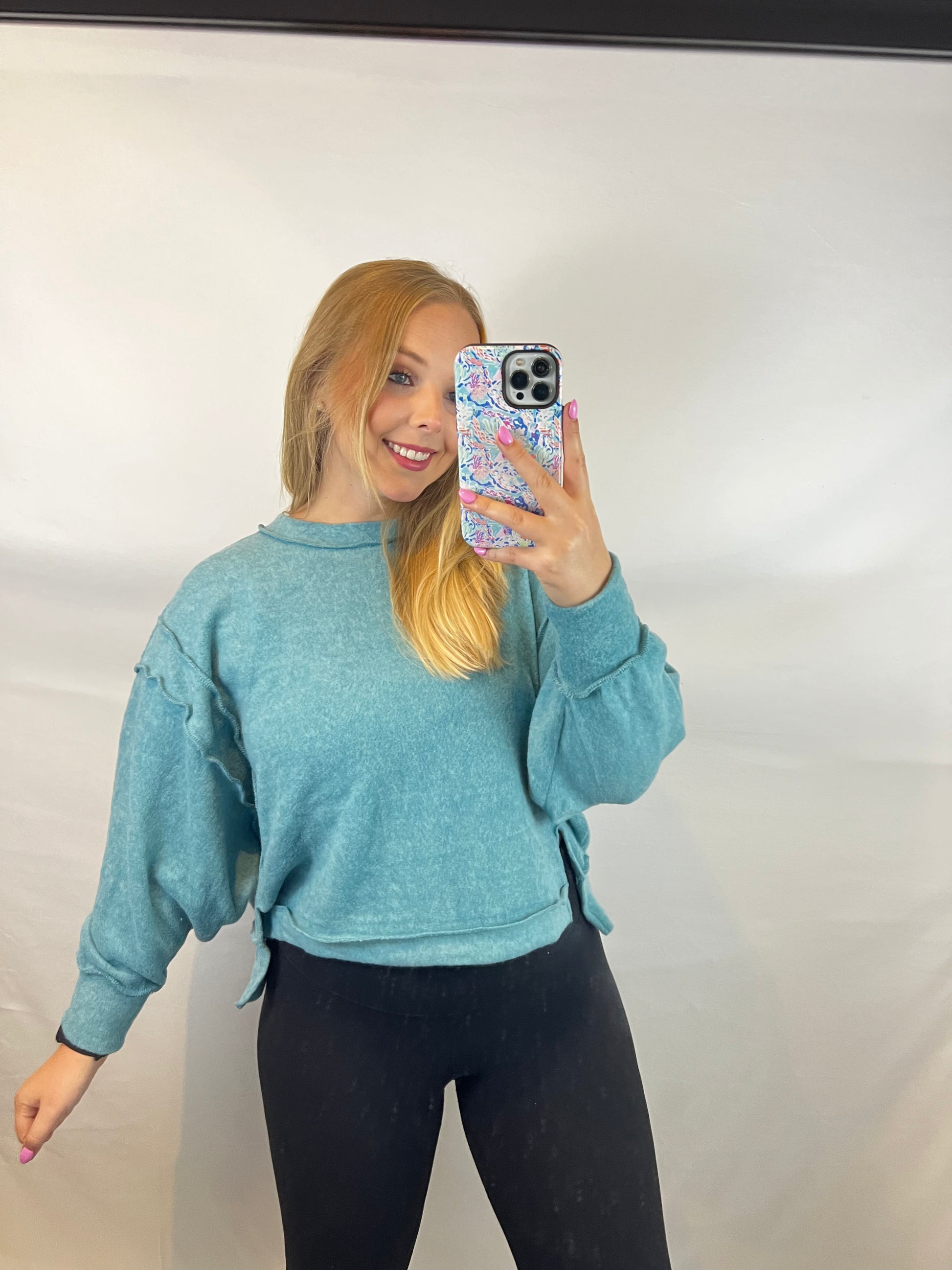 This sweater is so soft and comfy! Throw it on with a pair of leggings and your fav sneakers for a cute everyday look! Maddie is wearing the L/XL.