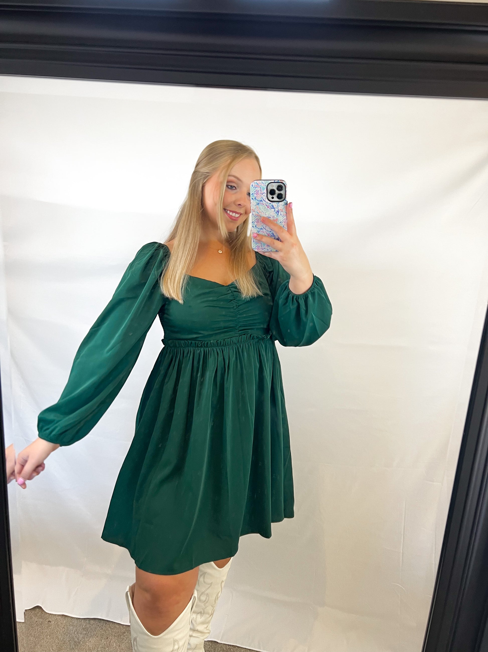This lightweight dress is so flattering! It is a baby doll style, with a sweetheart neck, smocked back, a small ruched detail on the front, and long peasant sleeves. It is a perfect dress for fall, especially for Thanksgiving. Maddie paired it with knee high cowgirl boots for a cute fall look. She is wearing a medium for reference.